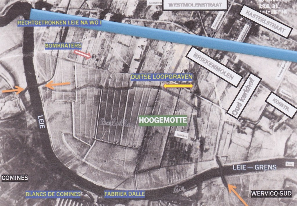 26 juni 1918. Deze dag staat genoteerd als de dag waarop een geallieerd squadron rond 20 uur een luchtaanval uitvoerde boven de Leievallei te Wervik en Bousbecque, en vier fatale bommen dropte boven de ingang van de fabriek Blancs de Comines. Het resultaat was verschrikkelijk: op deze plaats stierven 38 opgeëiste Zivilarbeiter uit Hamme, Zele en Baasrode. Niets herinnert nog aan dit triestig feit. Zelfs hun namen zijn onvindbaar op het lokale kerkhof.